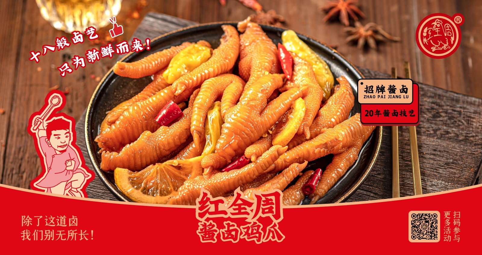 紅全周品牌創立于2012年,其生產總部坐落在以“紅全周雞爪”聞名的福建泉州市南安洪瀨鎮,經張福來師傅多年研制而成的獨家秘方,獨特的鹵制工藝,以“鮮、香、韌、辣”的特點,贏得廣大食客的交口稱贊。紅全周繼承中華美食傳統,堅持以“細微處見風范,毫厘間定乾坤”的服務準則,遵循現代健康飲食理念,精選上等食材,致力為消費者提供安全、健康的美食新體驗。